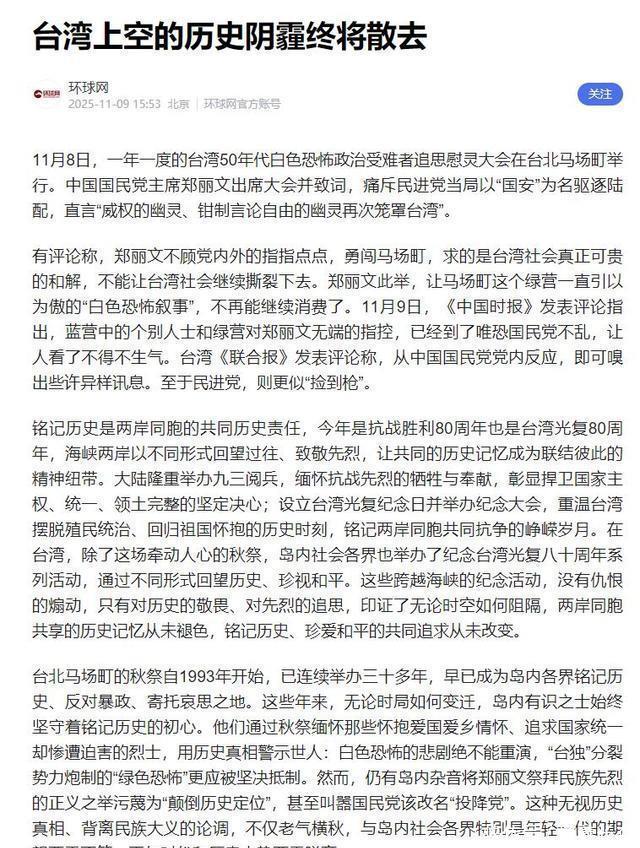 官媒发声力挺! 11月10日,《环球时报》旗下专栏“北平锋”发文点赞郑丽文出席“白色恐怖受难者”秋祭追思会,直言她这一步彻底打破了绿营的歪招。 《环球时报》的主办单位是人民日报社,其旗下专栏的发声,在很大程度上代表着大陆官方对这一事件的态度。